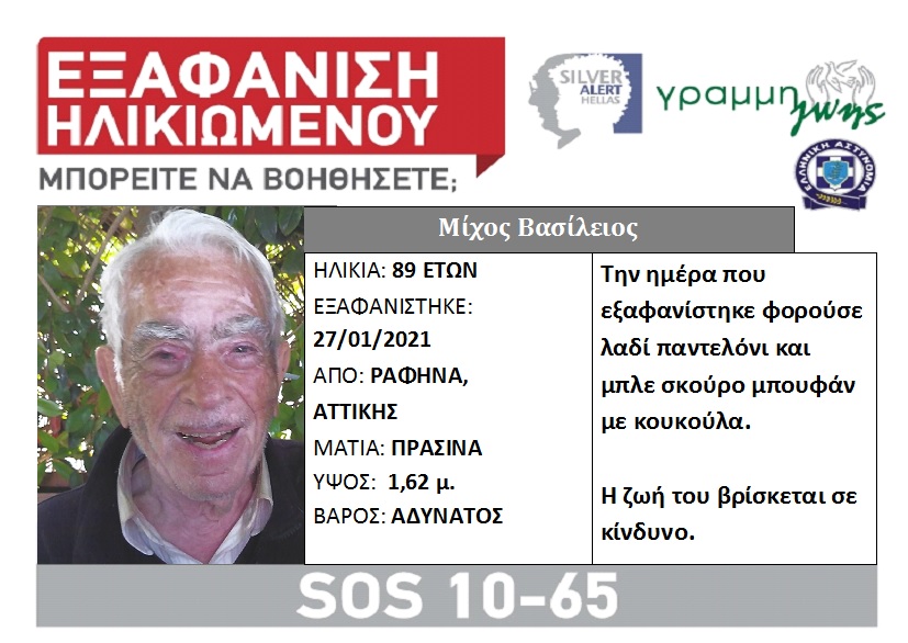 Ο Μίχος Βασίλειος, 89 ετών, στις 27/01/21 εξαφανίστηκε από την περιοχή της Ραφήνας, Αττικής. Έχει πράσινα μάτια, ύψος 1,62μ και είναι αδύνατος. Την ημέρα που εξαφανίστηκε φορούσε λαδί παντελόνι και μπλε σκούρο μπουφάν με κουκούλα.