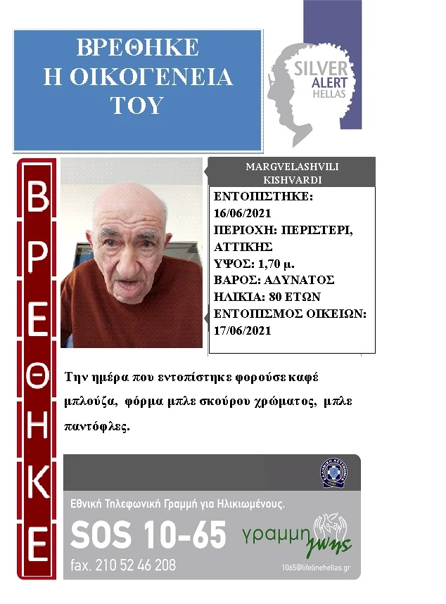 Ξαναβρήκε την οικογένειά του, χάρη στην ενεργοποίηση του SILVER ALERT ΑΓΝΩΣΤΩΝ ΣΤΟΙΧΕΙΩΝ, ο κος MARGVELASHVILI KISHVARDI, που είχε βρεθεί περιπλανώμενος την 16/06/2021.